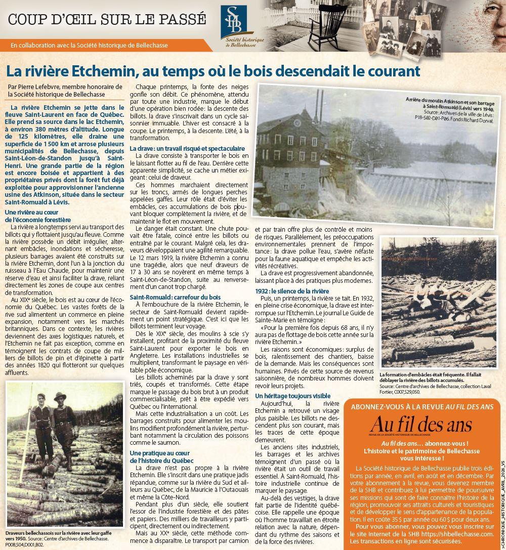 La Société historique de Bellechasse (SHB) collabore avec le journal « La Voix du Sud » pour offrir à ses lecteurs une fenêtre mensuelle sur le passé, au moyen d'une page dédiée à l'histoire de Bellechasse. Le numéro publié le 22 avril 2026 traite de l'époque où on flottait le bois sur la rivière Etchemin.