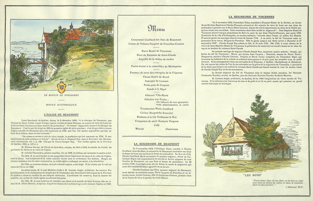 Extrait du menu servi lors du bicentenaire de 1933 de la paroisse de Saint-Étienne de Beaumont. Chacun des services porte un nom à connotation historique. Fonds de la fabrique de Saint-Étienne-de-Beaumont (P024,S02,D01) Archives Bellechasse.