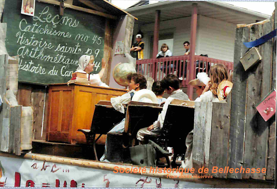 Char allégorique présentant une institutrice donnant ses leçons lors du défilé entourant les festivités du 250e anniversaire de la paroisse de Saint-Charles en 1999. Fonds Famille Frenette (P027,S02,SS01,D01) Archives Bellechasse.