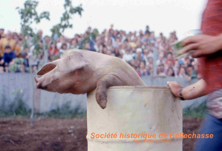 Marcel Boivin réussit à mettre le cochon dans le baril. Photographie prise lors du rodéo de cochon du Charolais Champêtre de 1974. Fonds Jacques Michaud (P014,S01,D02), Archives Bellechasse.