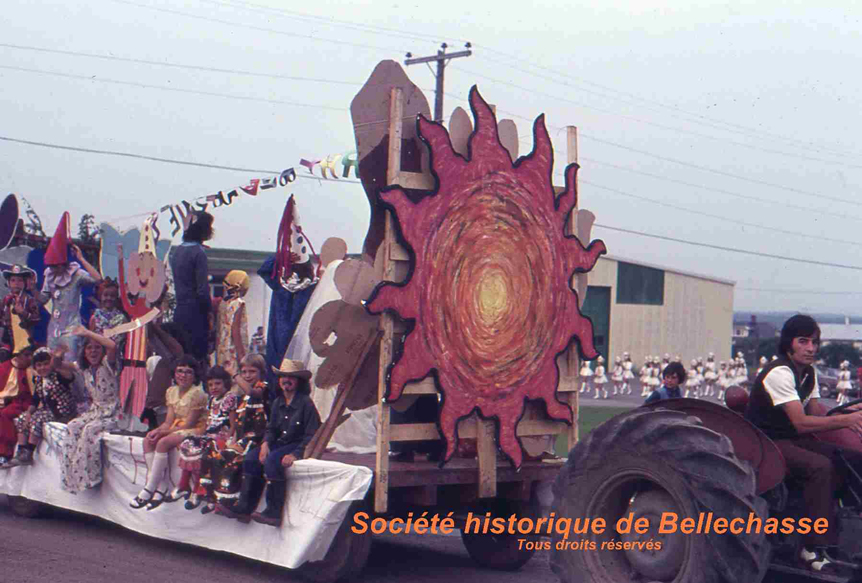 Char allégorique des jeunes du terrain de jeux lors du Charolais Champêtre de 1973. Marcel Patry conduit le tracteur. Fonds Jacques Michaud (P014,S01,D02), Archives Bellechasse.