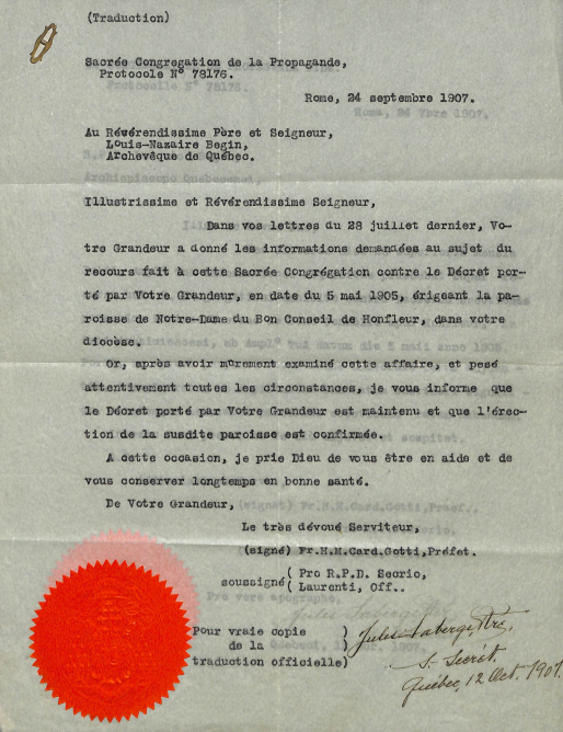 Traduction accompagnant la confirmation, en latin, de l’érection canonique de la paroisse de Honfleur en date du 24 septembre 1907