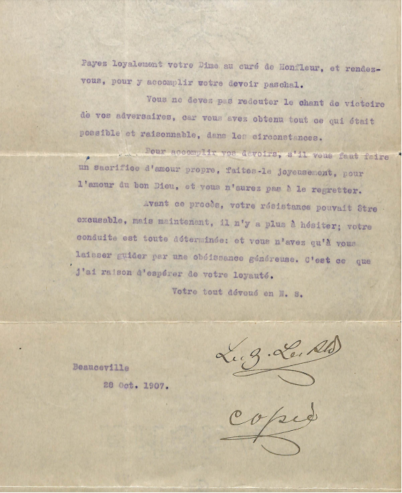 Résultat du procès à Rome concernant l’érection canonique de Honfleur annoncé par l’abbé L-Zoël Lambert de Beauceville, représentant des opposants. Dans cet extrait de la lettre du 28 octobre 1907, l’abbé Lambert demande aux opposants de cesser toute forme de résistance et de faire preuve de loyauté envers la décision de l’Église. Fonds de la fabrique de Honfleur (P017,S02,D02), Archives Bellechasse.