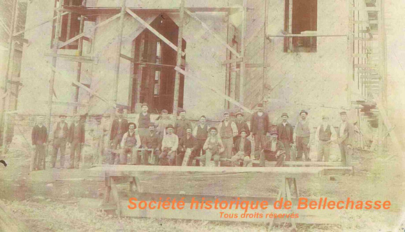 Ouvriers sous la direction d'Elzéar Métivier construisant l'église de Saint-Malachie en 1897. Les plans de l’église proviendraient de l’architecte David Ouellet.