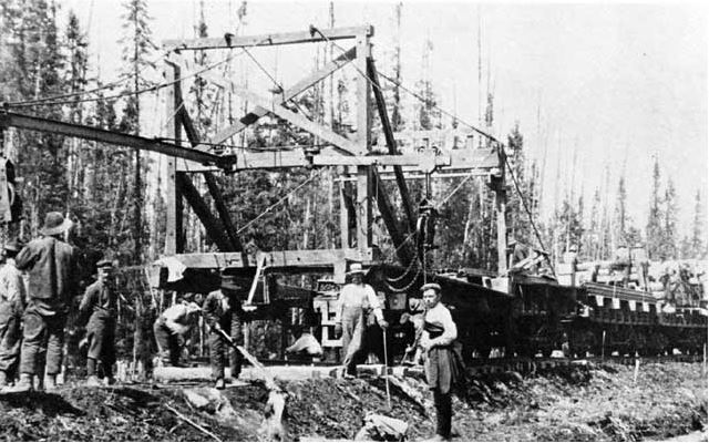 Afin de donner une pente douce à la voie ferrée du National Transcontinental, il a fallu trancher dans les ondulations du terrain et combler des vallées. Après le déboisement, l'essouchage et le dynamitage de caps rocheux, des centaines d'hommes s'affairaient pour construire les déblais et les remblais, ne même que pour assurer le drainage de la voie. Les matériaux étaient parfois acheminés par la nouvelle voie ferrée, au fur et à mesure de la progression du chantier. Des banneaux à chevaux ont beaucoup servi pour déplacer des roches. Des pelles à cables à vapeur ont aussi été utilisées.