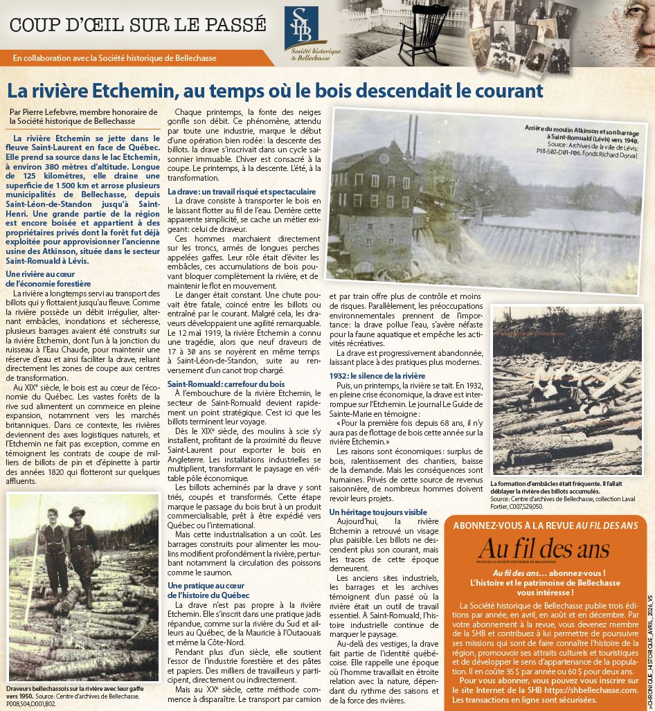 La Société historique de Bellechasse (SHB) collabore avec le journal « La Voix du Sud » pour offrir à ses lecteurs une fenêtre mensuelle sur le passé, au moyen d'une page dédiée à l'histoire de Bellechasse. Le numéro publié le 22 avril 2026 traite de l'époque où on flottait le bois sur la rivière Etchemin.