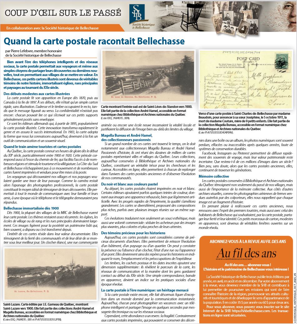 La Société historique de Bellechasse (SHB) collabore avec le journal « La Voix du Sud » pour offrir à ses lecteurs une fenêtre mensuelle sur le passé au moyen d'une page dédiée à l'histoire de Bellechasse. Le numéro publié le 22 octobre 2025 traite des cartes postales associées à la région de Bellechasse.